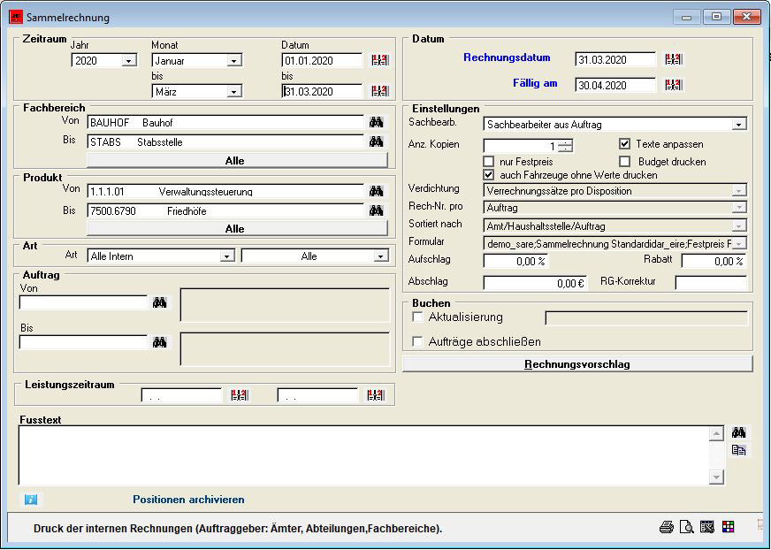 Bei der Fakturierung ist unabhängig von der gewählten Abrechnungsart der gleiche Ablauf gegeben. Die Daten können nach unterschiedlichen Kriterien (beliebige Zeiträume, Auftraggeber, Auftragsarten) zu einem Rechnungsvorschlag zusammengestellt werden. Dieser Vorschlag kann anschließend gedruckt werden.
