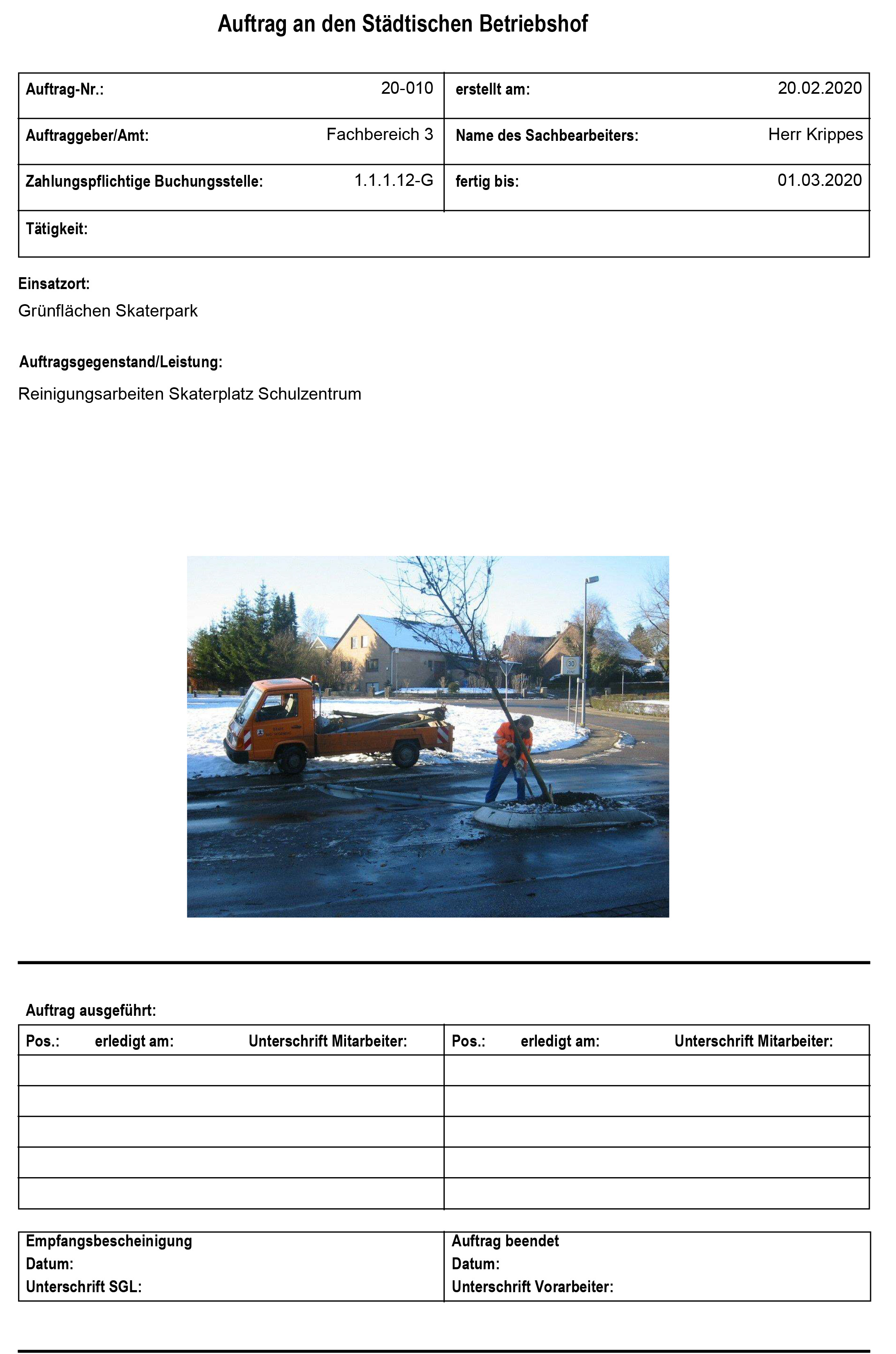 Die Anlage von Einzelaufträgen kann dezentral auf dem Bauhof, aber auch direkt in der Verwaltung (siehe Modul LIMES Auftrag / Info) erfolgen.