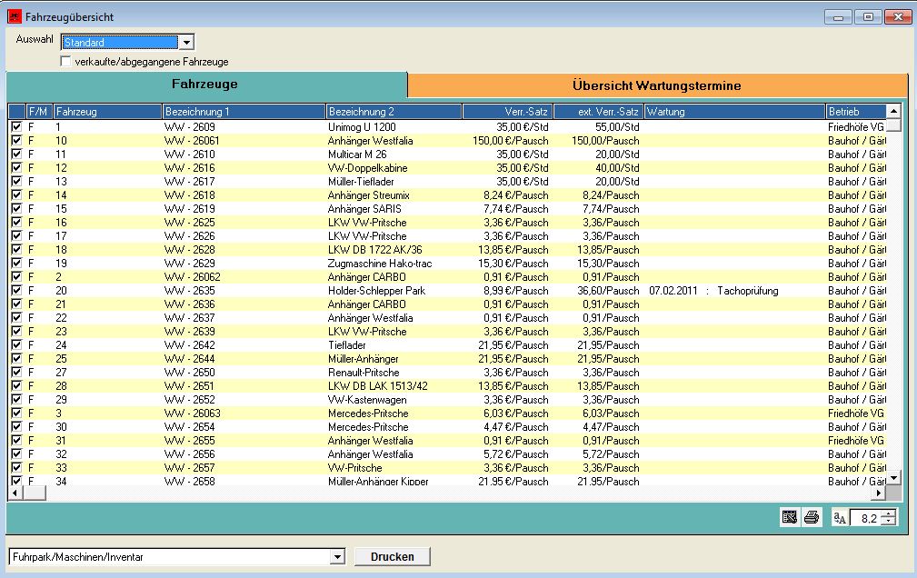 Auch die Fuhrpark- und Maschinenverwaltung ist komplett in das Gesamtverfahren integriert. Wie bei den Personen können für Fahrzeuge und Maschinen bis zu zwei unterschiedliche Verrechnungssätze ermittelt und hinterlegt werden.Mögliche Verrechnungsarten sind die Abrechnung nach Stundensätzen, Fahrleistungen nach Kilometern und Pauschalen.