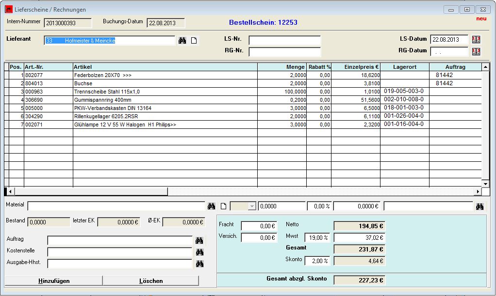 Beim Wareneingang findet die Erfassung der einzelnen Artikel mit den Liefermengen statt. Bei der Ermittlung des letzten EK-Preises bzw. des gleitenden Durchschnittspreises werden dabei die Kosten für die Beschaffung (Verpackungs- und Versandkosten, MWST) sowie eventuelle Rabatte automatisch berücksichtigt und auf die einzelnen Positionen anteilig berechnet.