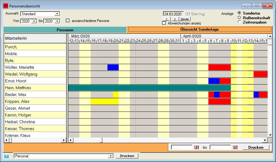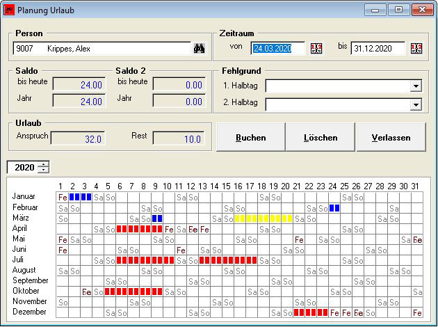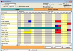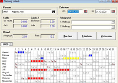 Über die Sonder- und Urlaubstageverwaltung können alle Ganztagsfehlzeiten (Urlaub, Abfeiern, Krank usw.) eingetragen werden. Für jeden Mitarbeiter wird eine grafische Jahresübersicht bereitgestellt. Bei der Erfassung von Leistungen wird auf bereits eingetragene Sondertage hingewiesen, so dass Fehleingaben vermieden werden. Nach Abschluss der Erfassungsarbeiten kann für beliebige Zeiträume geprüft werden, ob sämtliche Leistungen und Fehlzeiten vollständig eingetragen wurden.