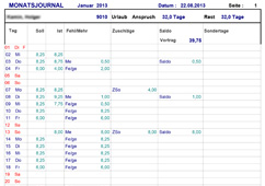 Im Personalbereich steht Ihnen eine Vielzahl von Auswertungen zur Verfügung. Das Monatsjournal enthält eine Übersicht über die gebuchten Arbeitszeiten und Zuschläge. Die Darstellung der Sondertage unterstützt Sie bei Ihrer Einsatzplanung. Das Lohnjournal enthält eine Aufstellung aller Zeitkonten, die für die Personalabrechnung benötigt werden und kann dort als Buchungsbeleg eingesetzt werden.