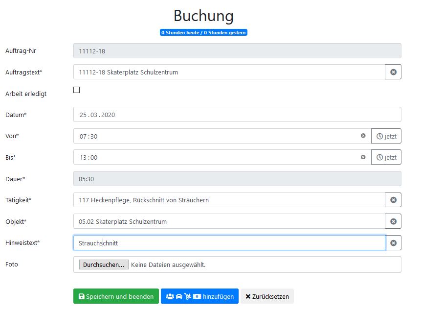 Beim Buchen der Gesamtzeit wird nur die Dauer der Arbeit an einem Auftrag gebucht. Beim Buchen von Beginn und Ende einer Tätigkeit werden die tatsächlichen Uhrzeiten gebucht, die Berechnung der Arbeitsdauer erfolgt automatisch. Beide Buchungsvarianten erfolgen immer zum Ende der Tätigkeit und sind auch nachträglich möglich. Zusätze wie Fahrzeuge, weitere Personen oder Material werden bei diesen beiden Varianten im Anschluss an die Eingabe der Zeiten erfasst. Beim Buchen mit der Start-Stop-Automatik wird live der Beginn der Tätigkeit und das Ende der Tätigkeit gebucht. Ein nachträgliches Buchen ist dann nicht mehr möglich. Über die Konfiguration wird eingestellt, welche der Buchungsvarianten aktiv ist. Die Nutzer müssen also nicht die passende Variante auswählen. Ein versehentliches Buchen mehrerer Tätigkeiten für den gleichen Benutzer in unterschiedlichen Buchungsvarianten ist somit ausgeschlossen. Zusätze wie Fahrzeuge, weitere Personen oder Material werden bei dieser Variante zwischen Start und Stop einer Tätigkeit erfasst.