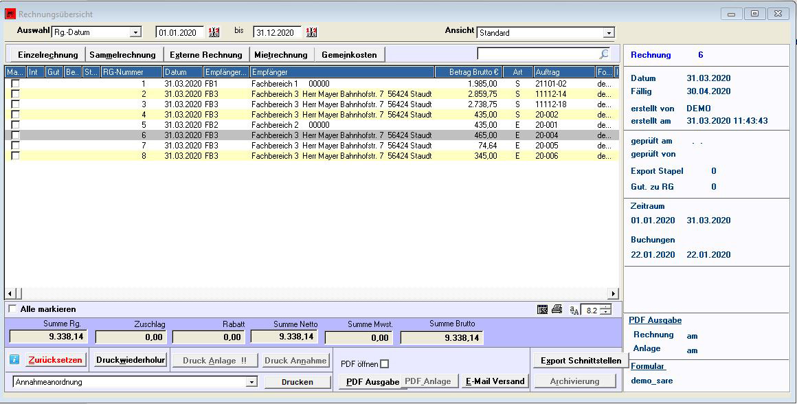 Die Rechnungsübersicht stellt alle Funktionen rund um die Fakturierung zur Verfügung: