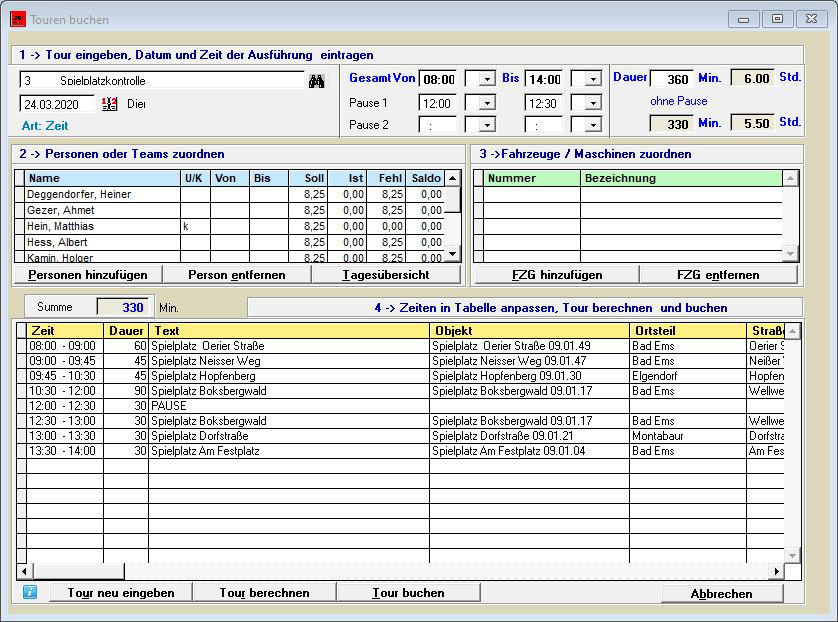 Jeder Bauhof hat feste Touren (Spielplatzkontrolle, Räum- und Streupläne, Straßenreinigung). Touren bestehen aus wiederkehrenden Buchungen, bei denen sich in der Regel kaum Änderungen ergeben. LIMES Bauhof enthält eine Verwaltung von Tourplänen, die zum Buchen herangezogen werden können. Abweichungen und Änderungen vom Tourenplan können sofort durchgeführt werden.