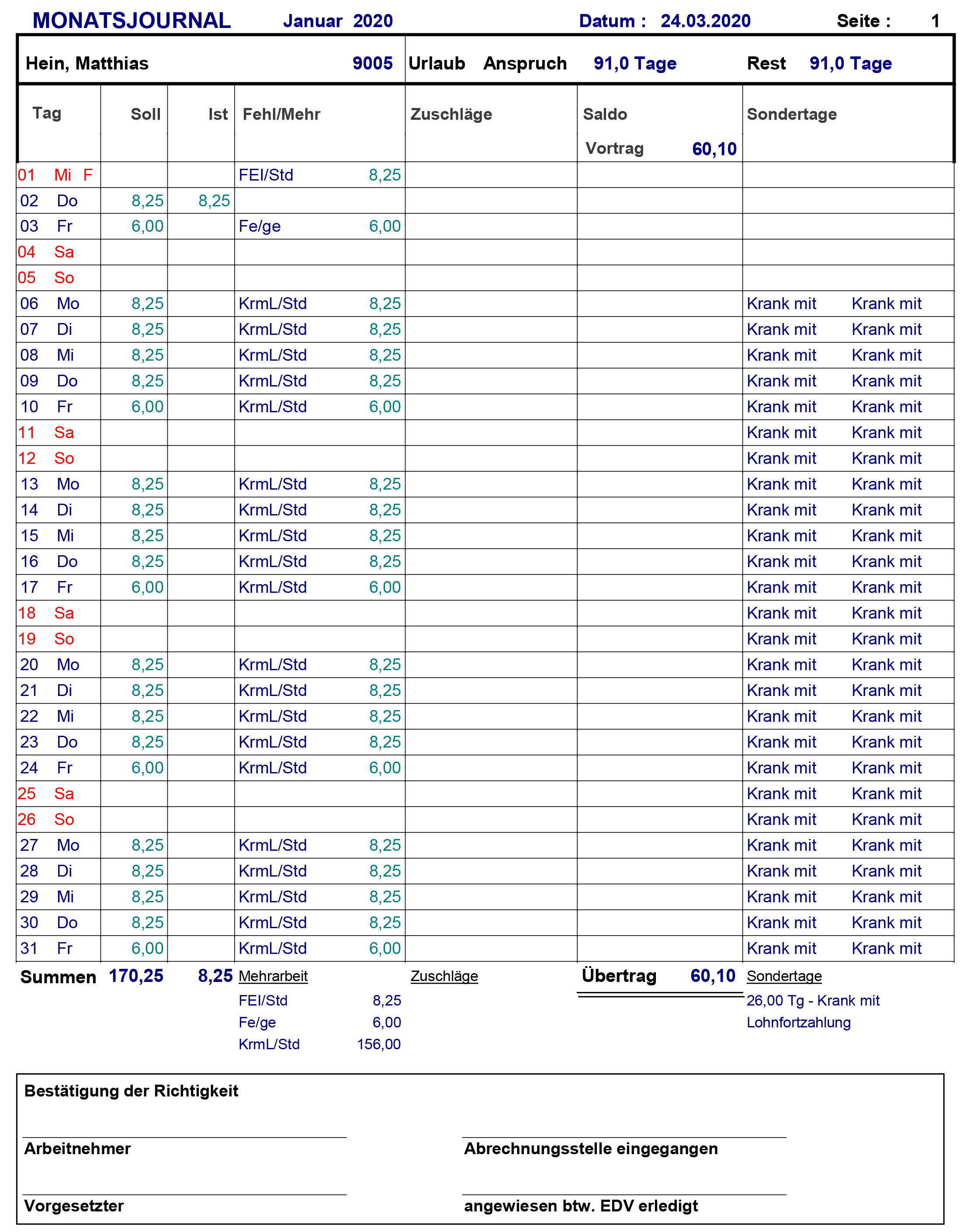 Über die Sonder- und Urlaubstageverwaltung können alle Ganztagsfehlzeiten (Urlaub, Abfeiern, Krank usw.) eingetragen werden. Für jeden Mitarbeiter wird eine grafische Jahresübersicht bereitgestellt. Bei der Erfassung von Leistungen wird auf bereits eingetragene Sondertage hingewiesen, so dass Fehleingaben vermieden werden. Nach Abschluss der Erfassungsarbeiten kann für beliebige Zeiträume geprüft werden, ob sämtliche Leistungen und Fehlzeiten vollständig eingetragen wurden.